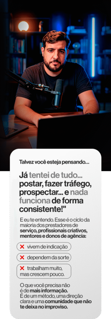 Um espaço onde você aprende, executa e cresce junto com donos de agência, prestadores de serviço, profissionais liberais, criativos, mentores e infoprodutores que querem escalar com consistência, previsibilidade e lucro.